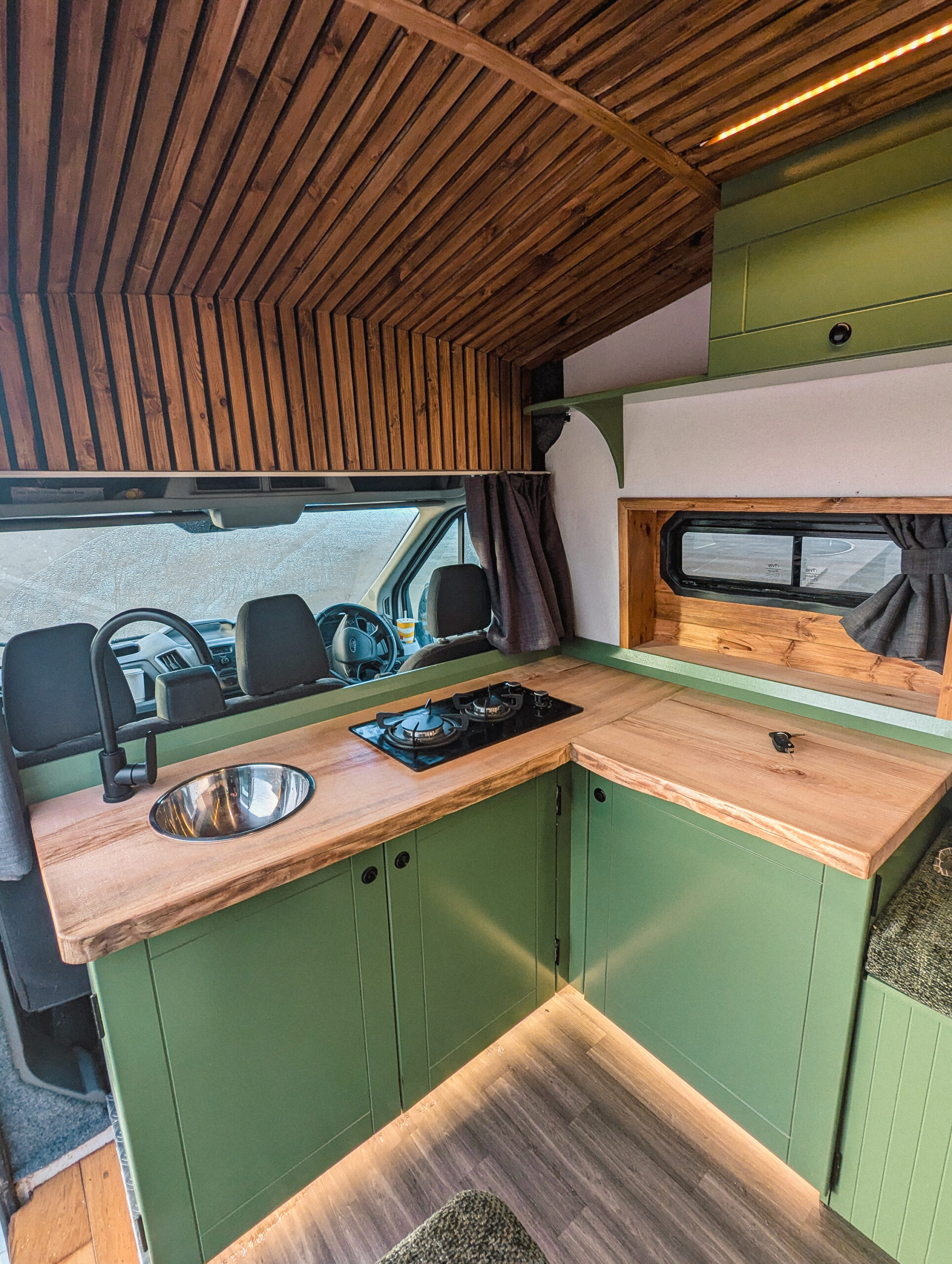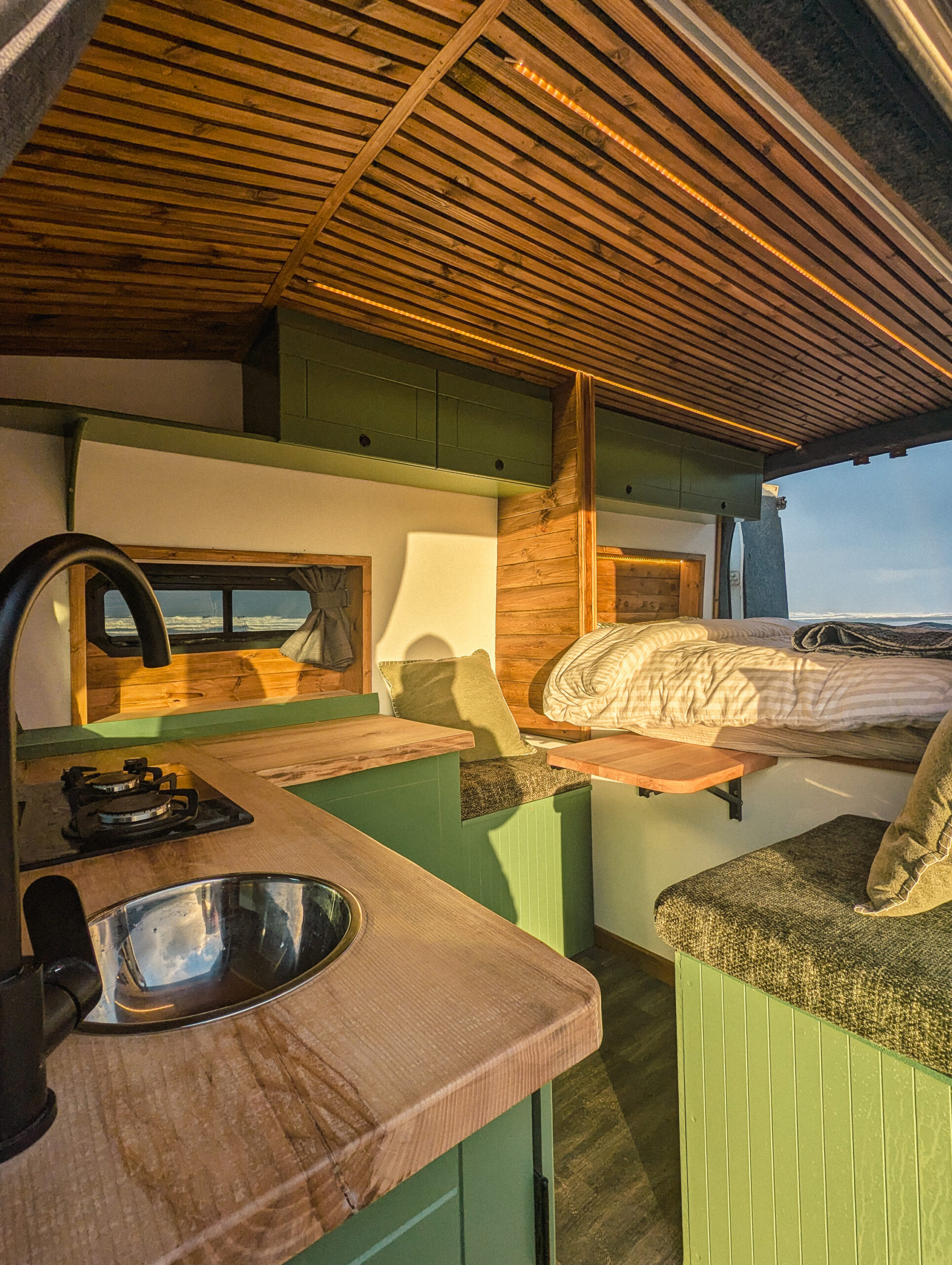 Kit is a premium Ford Transit conversion with 6ft2 standing height, gas hob, diesel heater, memory foam mattress, and a custom fitted kitchen. A proper home on wheels.